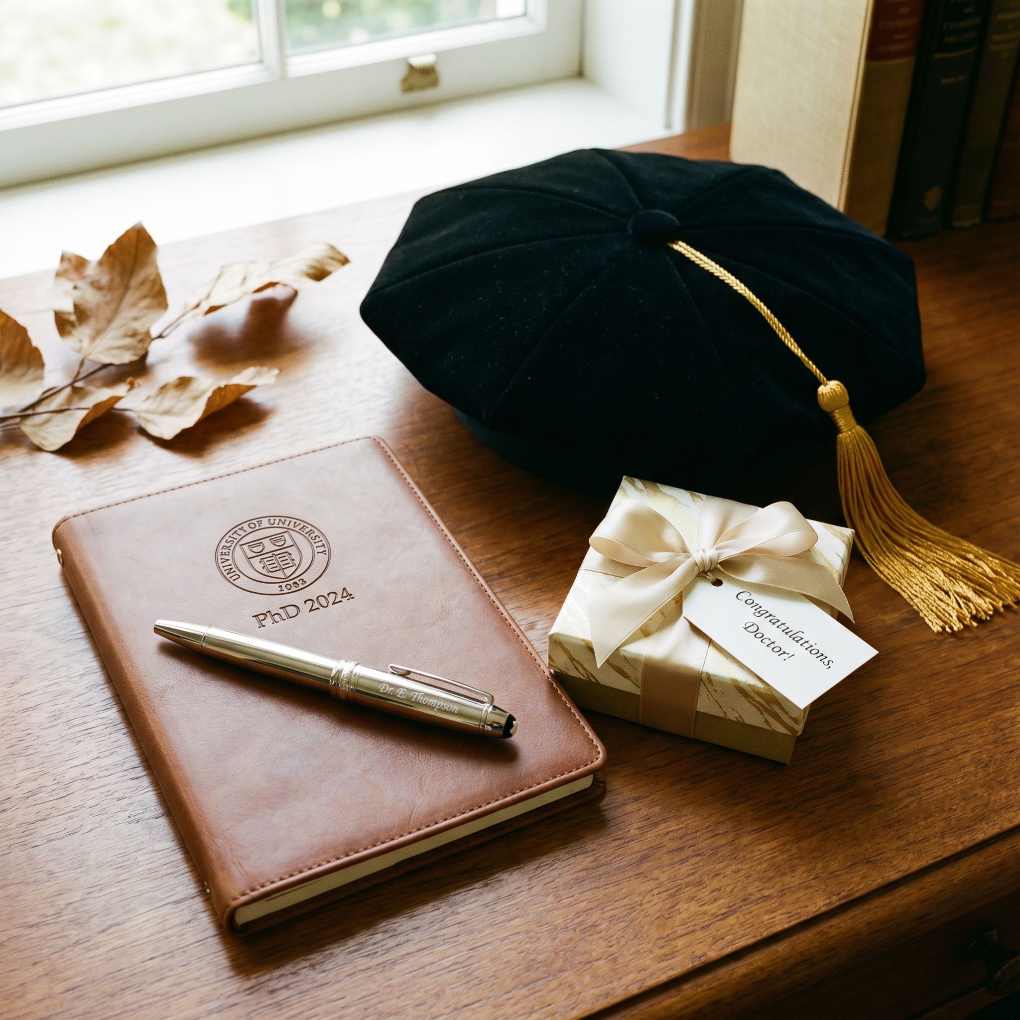 A pen engraved with "Dr." and their name. A custom frame for their diploma. A leather-bound journal for whatever comes next. These gifts feel elevated because they carry their new title, and there's something deeply satisfying about seeing "Dr." in front of your name for the first time.